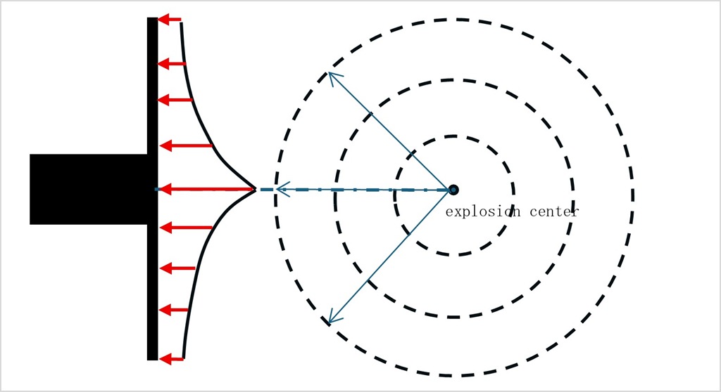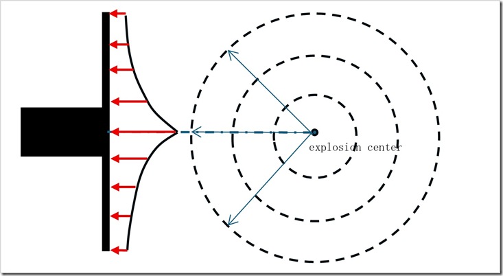 • 爆発中心から板表面までの距離は板状の位置により異なり、板が受ける爆圧は均一ではない。