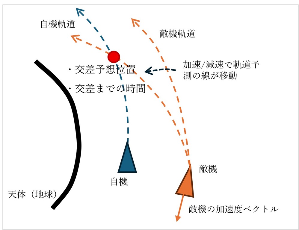 l 索敵・追尾システムは、探知、解析した対象物の位置・速度・加速度から、交差軌道に乗るまでの時間を推算して表示するのではないか?