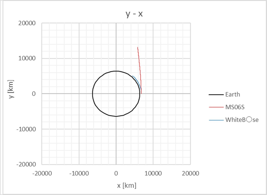 l 2機の宇宙機に、同対地高度、10[deg]の位相差を持つ位置から軌道航行を開始させる。