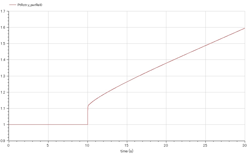 - 反応度印加の30秒後で、印加前定格出力の2倍に達しない程度しか出力は増大しない.